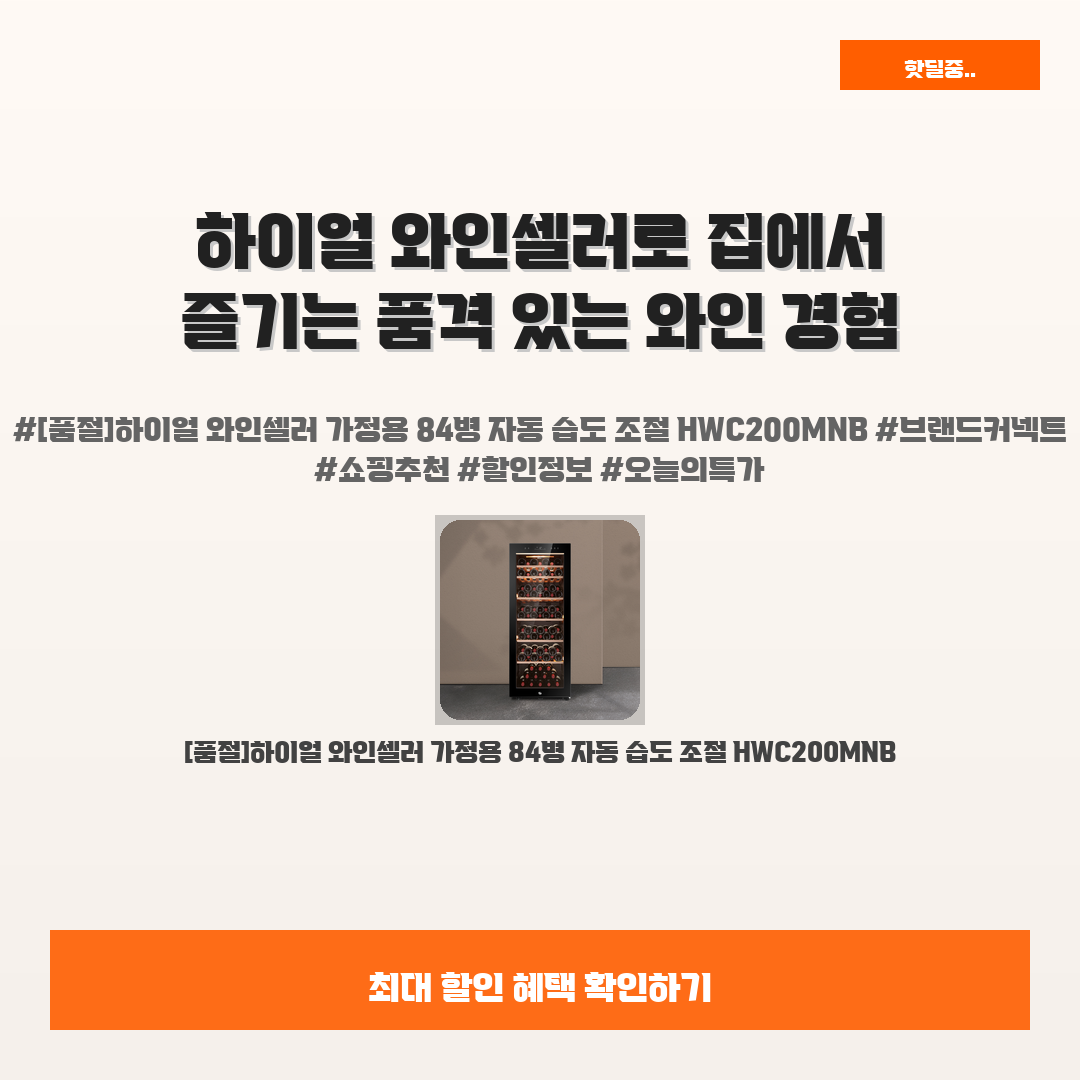 🛍️ 이 포스팅은 네이버 쇼핑 커넥트 활동의 일환으로,판매 발생 시 수수료를 제공받습니다.지금 소개할 제품은 바로,,맛과 품격을 동시에 갖춘 하이얼 와인셀러 가정용 84병 자동 습도 조절 HWC200MNB입니다!집에서 와인을 즐기는 당신, 와인의 품질을 유지하는 것이 중요하다는 것은 잘 아실 텐데요."요즘 와인이 자주 상해서 고민이야..."라는 당신의 고민을 해결해줄 최고의 선택이 바로 이 제품입니다.하이얼 와인셀러를 통해 당신의 와인을 최적의 조건에서 보관하고, 언제든지 품격 있는 와인 경험을 즐겨보세요!여러분의 특별한 순간에 진정한 기쁨을 더해줄 소중한 동반자가 되어줄 것입니다.혹시 한정된 공간 때문에 와인 보관이 어렵다는 생각은 하지 마세요!이 하이얼 와인셀러가 있다면 그 고민은 사라질 거예요!※..