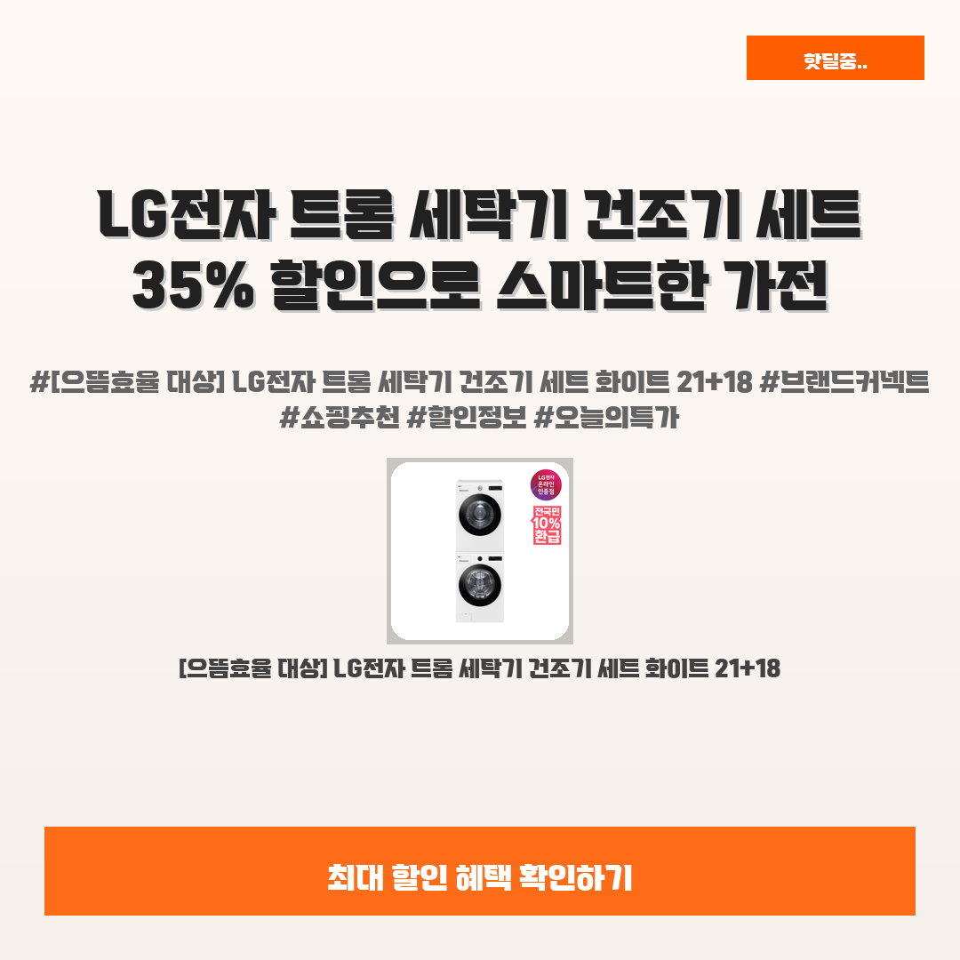 🛍️ 이 포스팅은 네이버 쇼핑 커넥트 활동의 일환으로,판매 발생 시 수수료를 제공받습니다.여기서 만나보세요,완벽한 세탁 솔루션인 [으뜸효율 대상] LG전자 트롬 세탁기 건조기 세트 화이트 21+18를!세탁과 건조를 동시에 해결하고 싶은 여러분, 이 제품이 제격입니다.3,200,000원에서 35% 할인된 2,056,000원으로 만나볼 수 있어요. 주부들의 생활을 혁신할 스마트한 선택이 될 것입니다!매일 반복되는 세탁의 번거로움에서 벗어나고 싶으시죠? 문제를 해결할 방법이 여기 있습니다! LG전자 트롬 세탁기 건조기 세트를 통해 시간과 에너지를 절약하며, 만족스러운 세탁 결과를 경험해 보세요.여러분의 삶을 더욱 편리하게 만들어 줄 가성비 최강 가전, 지금 바로 체크해보세요!후기들도 이미 많은 분들이 극찬하..