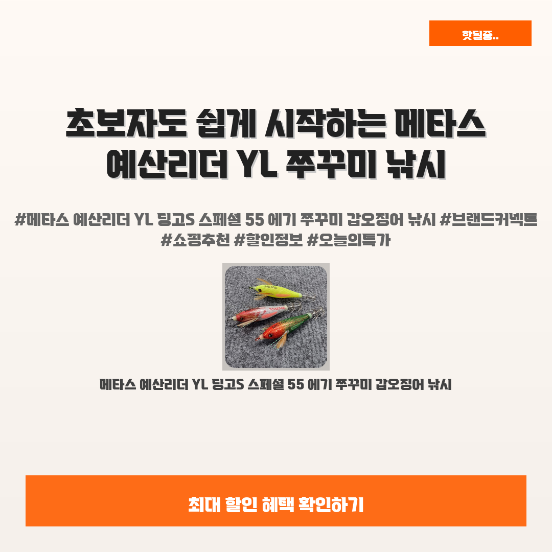 🛍️ 이 포스팅은 네이버 쇼핑 커넥트 활동의 일환으로,판매 발생 시 수수료를 제공받습니다.오늘 소개할 제품은 단언컨데,,그야말로 초보자도 쉽게 시작하는 메타스 예산리더 YL 딩고S 스페셜 55 에기 쭈꾸미 갑오징어 낚시입니다!낚시를 처음 접하는 분들이 자주 느끼는 고민, "어떤 장비를 선택해야할까?"이제 고민하지 마세요! 메타스 예산리더 YL가 여러분의 낚시 경험을 한층 더 높여줄 거예요.이 제품은 전문적인 기술이 없어도 손쉽게 사용할 수 있어요."이렇게 간단하게 쭈꾸미와 갑오징어를 잡을 수 있다니!"라는 감동을 직접 느껴보시길 바랍니다.그뿐만 아니라, 가성비도 뛰어나니 낚시의 즐거움을 저렴한 가격에 만끽할 수 있어요.저도 이 제품 덕분에 자신감 있게 낚시를 즐기고 있답니다. 진짜 추천드립니다!※ 이거..
