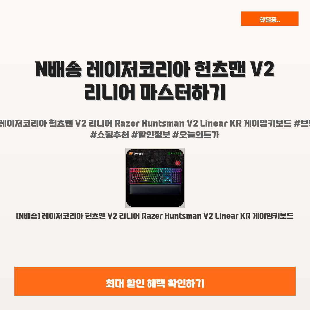 🛍️ 이 포스팅은 네이버 쇼핑 커넥트 활동의 일환으로,판매 발생 시 수수료를 제공받습니다.오늘 소개할 제품은 바로!N배송으로 만나볼 수 있는 레이저코리아 헌츠맨 V2 리니어 Razer Huntsman V2 Linear KR 게이밍키보드에요!요즘 게임할 때 최고의 성능을 발휘하는 키보드를 찾고 계신가요?당신의 플레이 스타일을 한층 더 끌어올려 줄 이 [N배송] 레이저코리아 헌츠맨 V2 리니어를 주목해보세요!진짜 이 키보드는 게임의 모든 순간을 바꿔줄 수 있는 제품이에요. 한 번 사용해보면 그 매력을 뼈저리게 느낄 수 있을 거예요.그 어떤 게임에서도 놓쳐서는 안 될 프리미엄 스펙을 자랑하니, 지금 바로 체험해보시길 추천드립니다!게다가 가격 역시 229,000원으로 적당하니 가성비도 놓치지 마세요!여러분의 ..