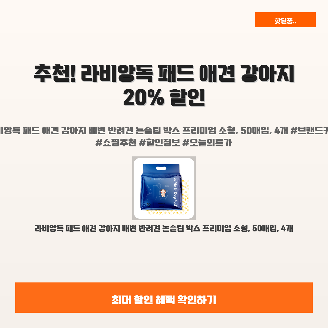🛍️ 이 포스팅은 네이버 쇼핑 커넥트 활동의 일환으로,판매 발생 시 수수료를 제공받습니다.오늘 소개할 제품은 단연코,,바로 라비앙독 패드 애견 강아지입니다!애완견 배변 문제로 고민하고 계신가요? 라비앙독 패드는 그런 당신을 위해 태어났어요!논슬립 박스 프리미엄 소형으로 설계되어 실용성과 편리함을 동시에 갖춘 이 패드는 최소한의 노력으로도 청결한 환경을 제공합니다.제가 이 패드를 사용한 이후로 정말 많은 고민이 해결됐어요. 안심하고 사용할 수 있어 더욱 편리하답니다!강아지 건강과 행복을 생각한다면, 정말 선택할 수 밖에 없는 최고의 상품이에요.무엇보다 20% 할인된 가격으로 지금 바로 만나볼 수 있으니, 이 기회를 놓치지 마세요!가성비와 효율성을 모두 만족시키는 라비앙독 패드, 지금 바로 확인하시길 바랍..